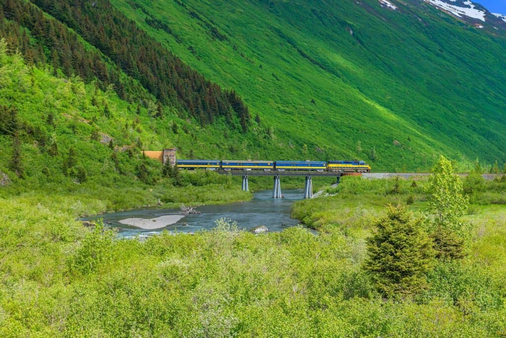 Another exciting mode of transportation for tourists in Alaska is train travel. Trains are an especially good choice for tourists because they are a much more eco-friendly choice than cars. We love this shot of an Alaskan train surrounded by lush green foliage.