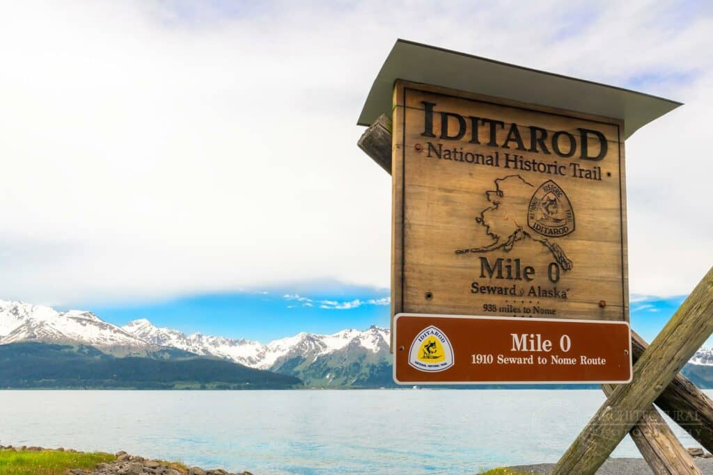 Alaska is home to the world-famous Iditarod Trail Sled Dog Race. This image focuses on the sign that marks the beginning of the race without taking away from its impressive background.